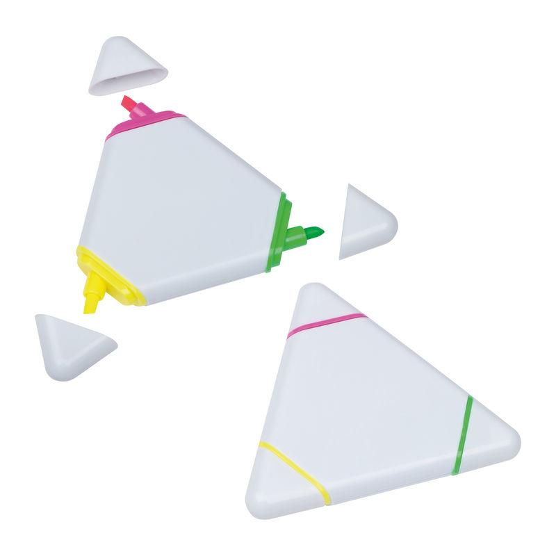 Highlighter triunghiular din plastic în culorile galben, verde și roz.