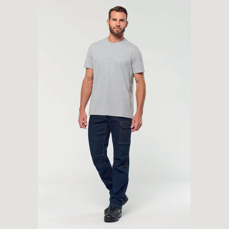 99% cotton/1% elastane. Washable at 60°C, slim fit, denim canvas. Tear-away brand label, reinforced pockets on front and back- left and right sides. 370 g/m². Denim canvas. Washable at 60°C. Slim fit. Button fastening with button cover and metal zip. Front: 2 slanted opening pockets. Left: reinforced seam pocket with flap and tear release fastening + 3-compartment over-pocket, 1 of which has pen compartment. Right: hammer pocket, tape pocket and over-pocket with tear release fastening. Back: 2 patch pockets with reinforced seams, 1 with a tear release fastening flap. Rounded belt at back with wide inner non-slip elasticated band for optimal support. Orange inner buckle at middle of back. Loops with reinforced seams including one large one in the middle of the back and 1 plastic ring at the front. Darts at the knee for added comfort. Reinforced crotch gusset for increased resistance and perfect freedom of movement. Triple overstitching on side seams, inside leg and rear split. Twin needle finish at hem. Tear-away brand label.