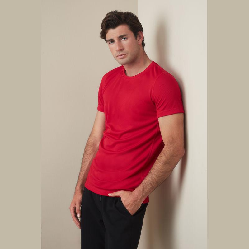 Modern and stretchy sports T-shirt for men made of quick-drying, breathable mesh-material. Contrast neck tape, decorative flatlock seams and excellent freedom of movement.