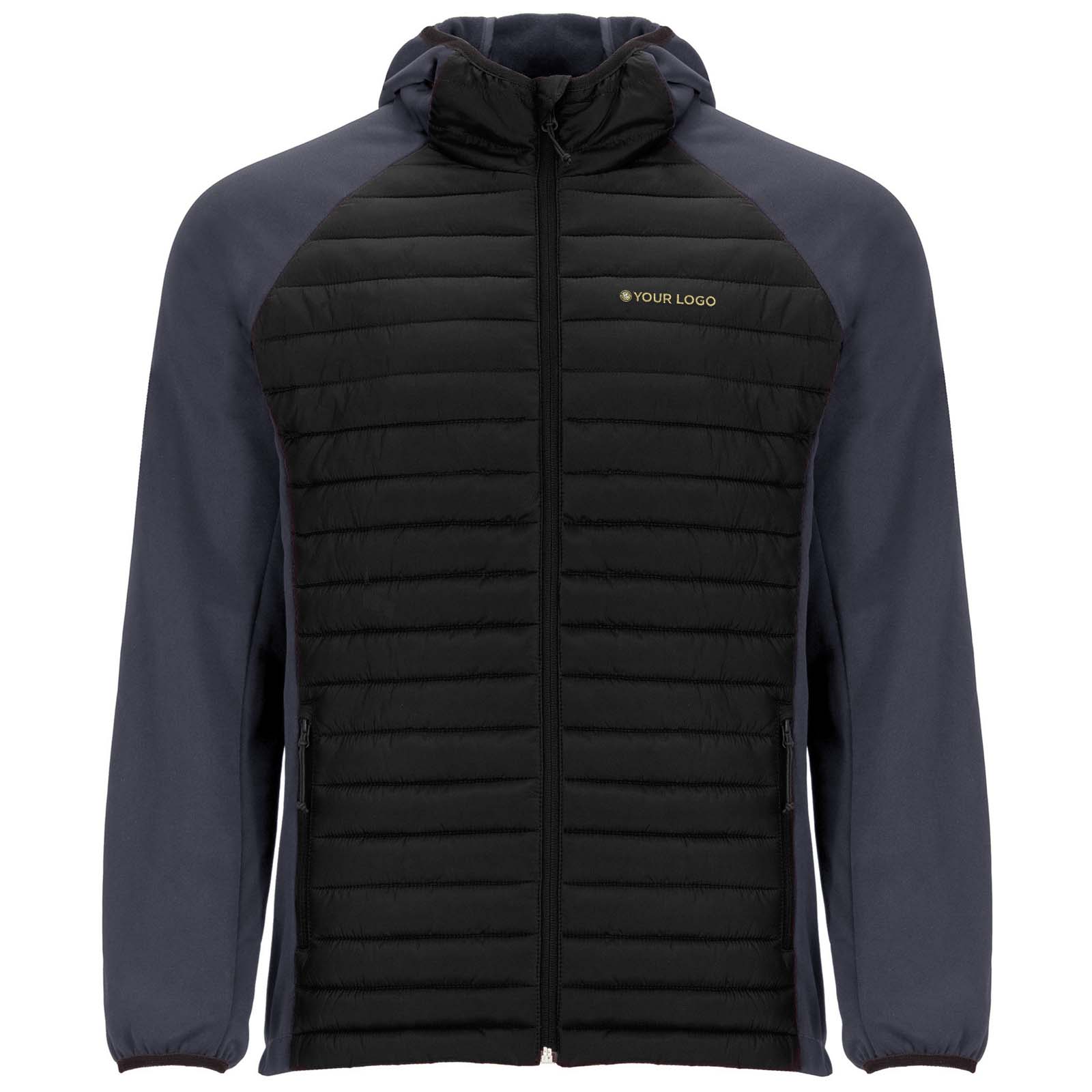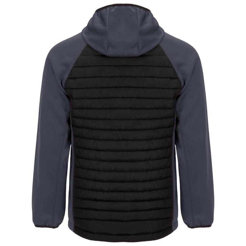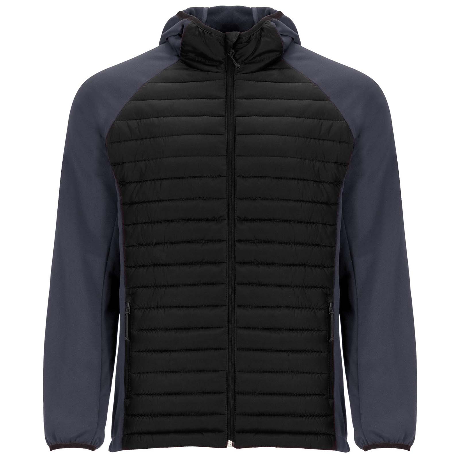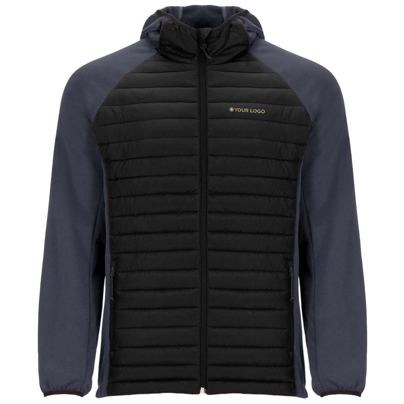 Unisex jacket in two-fabric combination: Fixed adjusted hood. Raglan sleeves. Sleeves, side panels and hood in softshell fabric. Quilted feather touch fabric in front and back. Inverted zip with matching chin protector and puller. Two front pockets with zippers. Matching elastic trim in collar, cuffs and hem. Removable label. Wind-proof model. The male model is 184 cm and is wearing size L, and the female model is 179 cm and is wearing size S.
