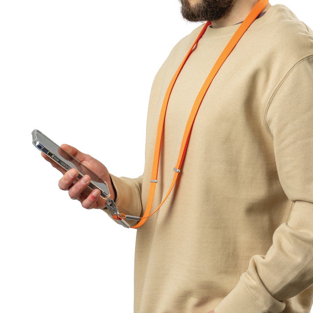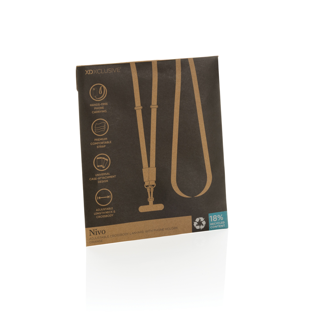 Nivo is a universal cross body phone lanyard designed to keep your device secure and always within reach. Made from recycled PET with premium-grade aluminium details, Nivo combines durability with a clean, modern look. The thick, high-quality strap is designed for maximum wearing comfort, making it ideal for daily use. Its universal and strong design works with any phone that uses a protective case, allowing you to carry your device safely without limiting functionality. Nivo can be worn comfortably around the neck or as a cross body strap, giving you complete hands-free convenience wherever you go. The adjustable strap can be easily set from 200 cm to 120 cm, ensuring a perfect fit for every user and wearing style. Made with RCS (Recycled Claim Standard) certified recycled PET and recycled aluminium. The total recycled content is 18% based on the total item weight. PVC free and packed in plastic-free FSC packaging.