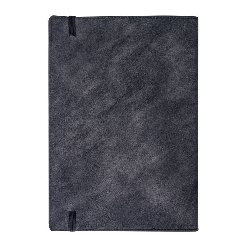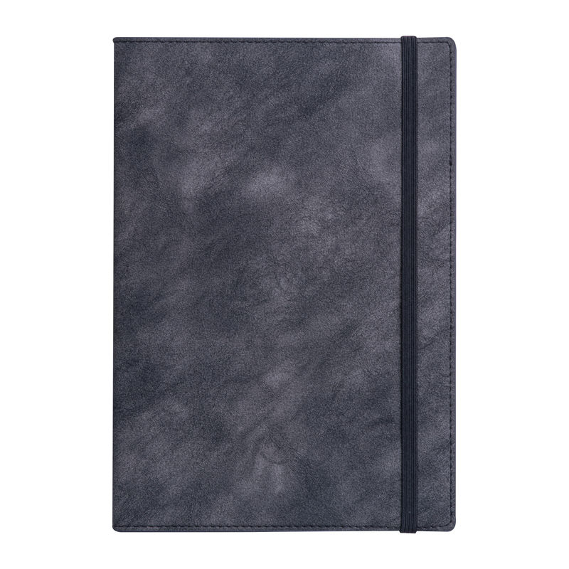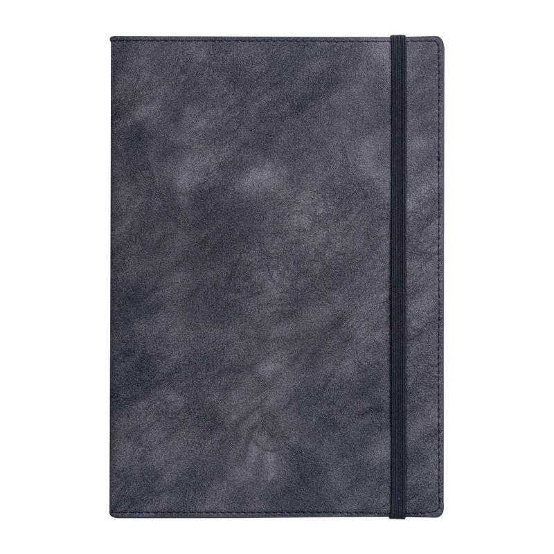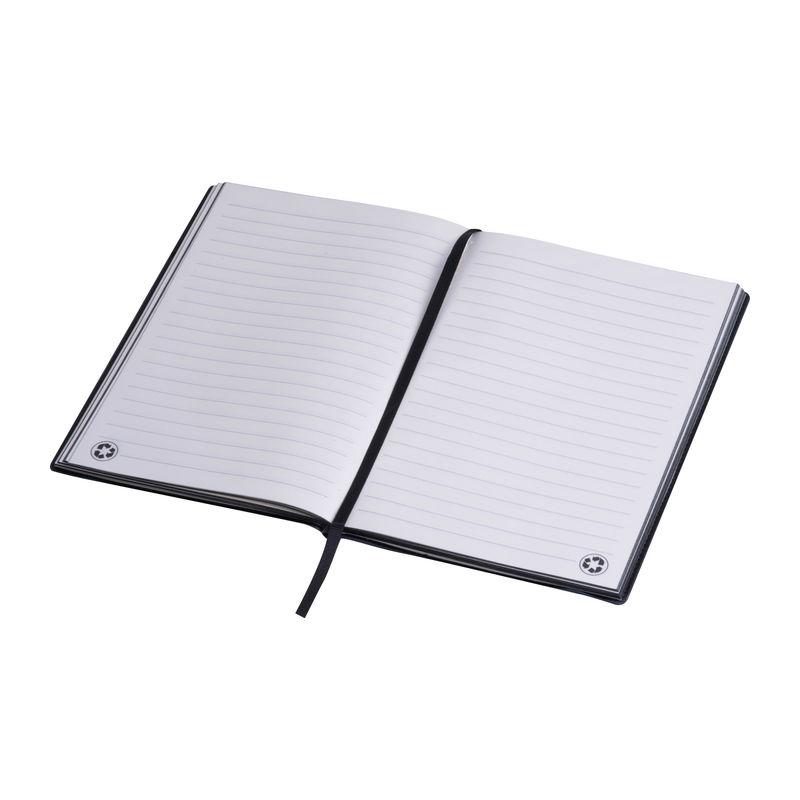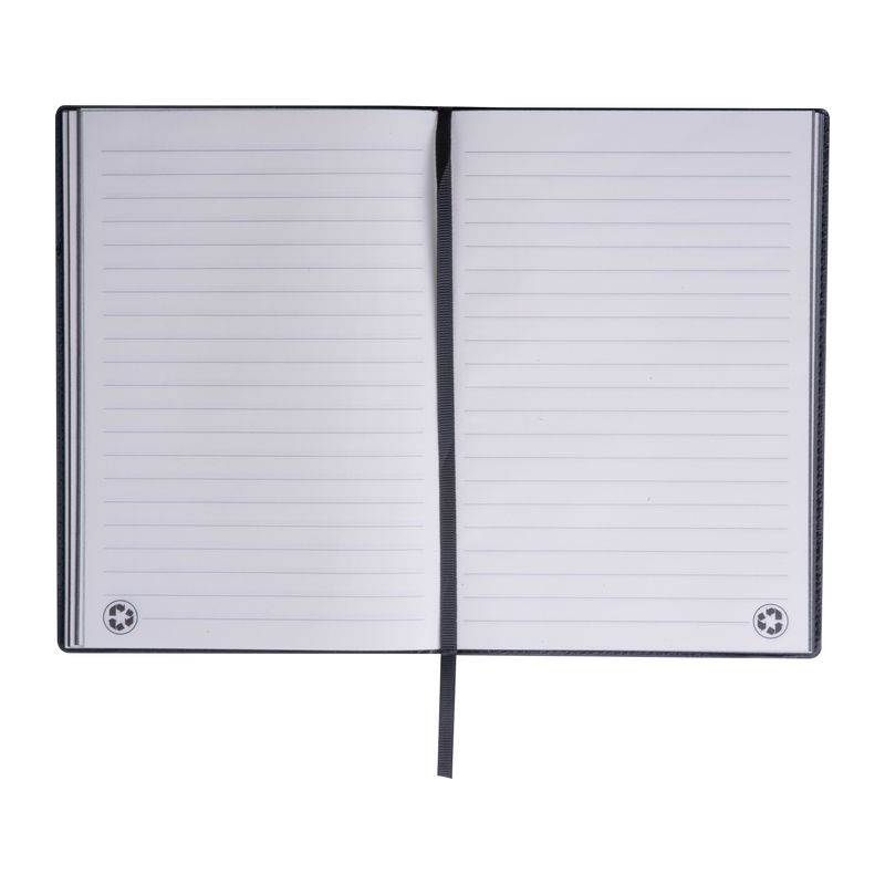 Caiet A5 cu copertă PU moale, 160 pagini liniate din hârtie reciclată, semn de carte din panglică și închidere cu bandă elastică.