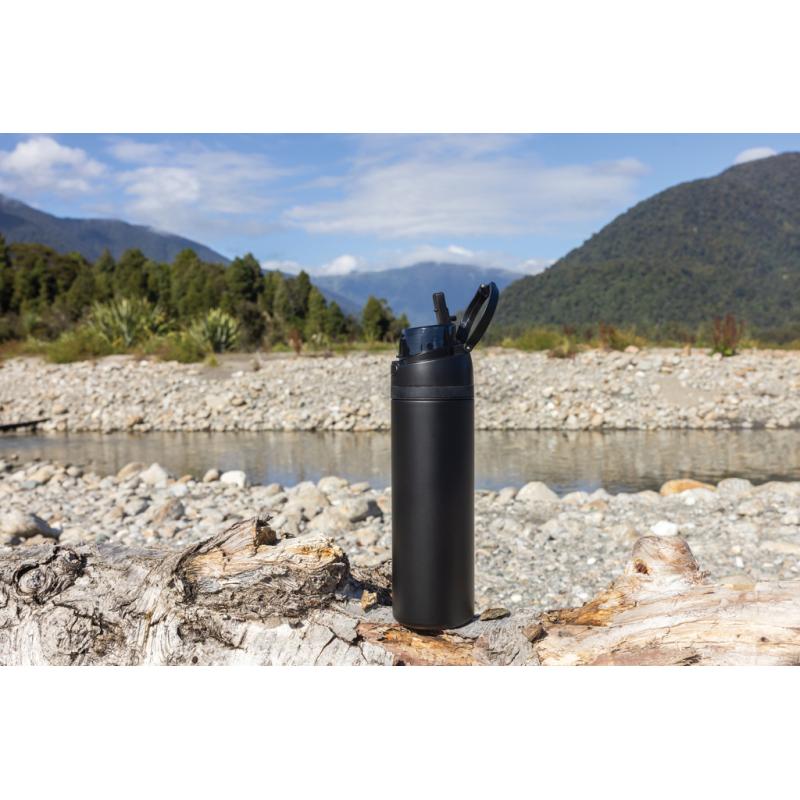 Introducing the Omni Sip Water Bottle. You deserve versatility in your hydration routine, and that's why we created the Omni Sip. This innovative bottle lets you choose how you drink. Sip through the built-in straw while holding it upright, or tilt it back to enjoy a sip from the wide-mouth opening. Ready for action at a moment's notice, just push the button to flip the top open, and push it back down to securely lock it shut, keeping out dirt and germs. 720ml content and made from RCS certified recycled steel. The Omni Sip is entirely leak-proof. Packed in FSC giftbox. Total recycled content: 67% based on total item weight.