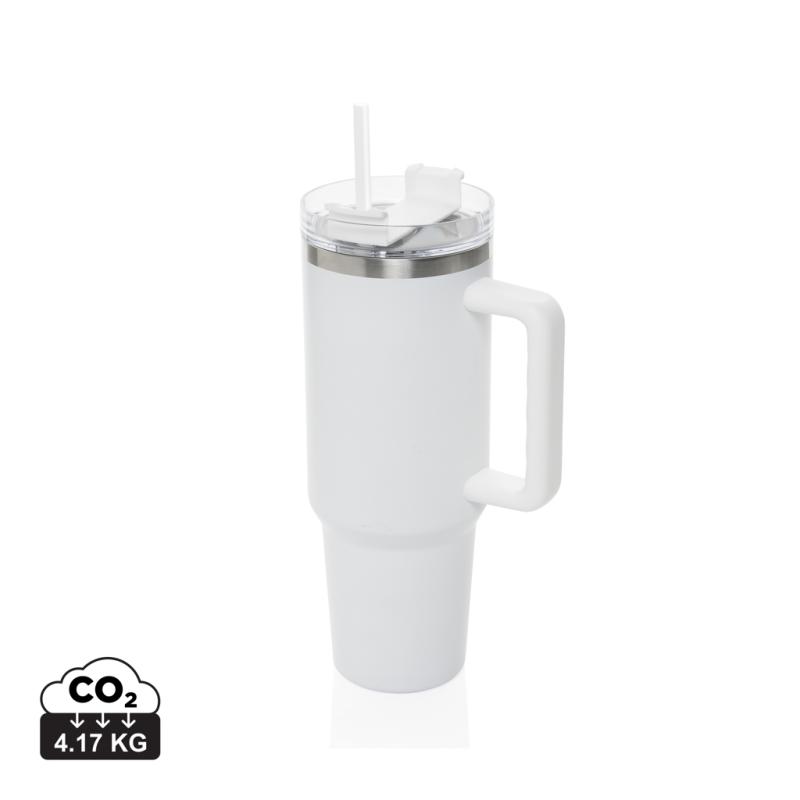Meet Peakflow, the ultimate 1200ml tumbler designed for those who need a little extra. Its comfort-grip handle and slim base make it easy to carry and fit into most cup holders, keeping you hydrated on the go. Outside made from durable recycled stainless steel, Peakflow’s double-walled, vacuum-insulated body keeps drinks at the perfect temperature. It features a spill-proof lid with a dual function for sipping or using the included recycled plastic straw. RCS-certified, with 29% recycled content, and BPA-free. Perfectly practical and lower impact, we recommend handwashing. Bulk packed.