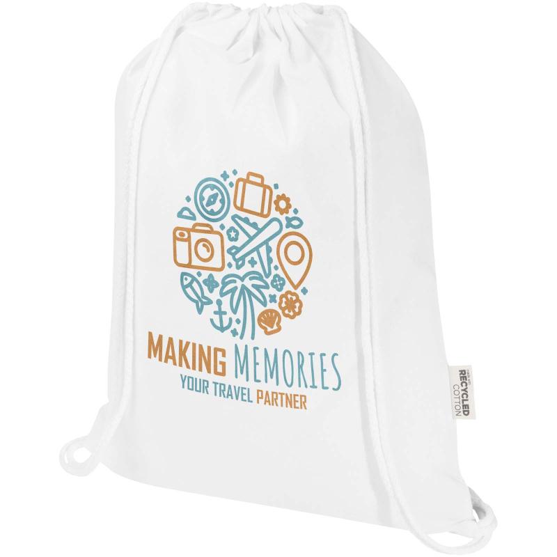 The Peru Blend drawstring bag is made from 60% GRS certified recycled cotton and 40% GRS certified RPET, making it a strong yet lightweight option for everyday use. Easy to carry on the back or shoulder, it features a large main compartment with a cotton drawstring closure that allows quick opening and closing. With 180 g/m² fabric, the bag is durable and offers plenty of space for adding a logo or message, making it ideal as a giveaway to promote your brand or campaign. The print methods available for this bag are also GRS certified, ensuring a transparent and fully certified supply chain. The bag can hold up to 5 kilos weight.