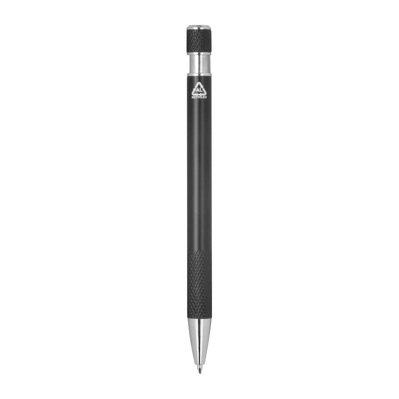 Pix din aluminiu reciclat, cu grip modelat, mecanism cu buton și mină albastră.