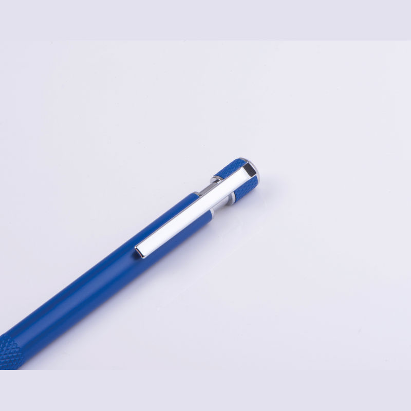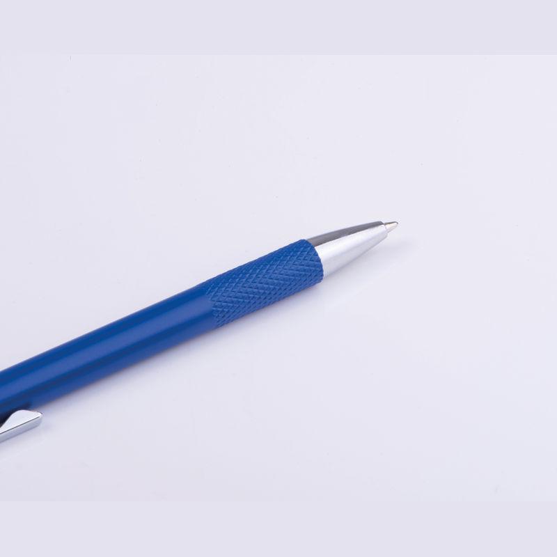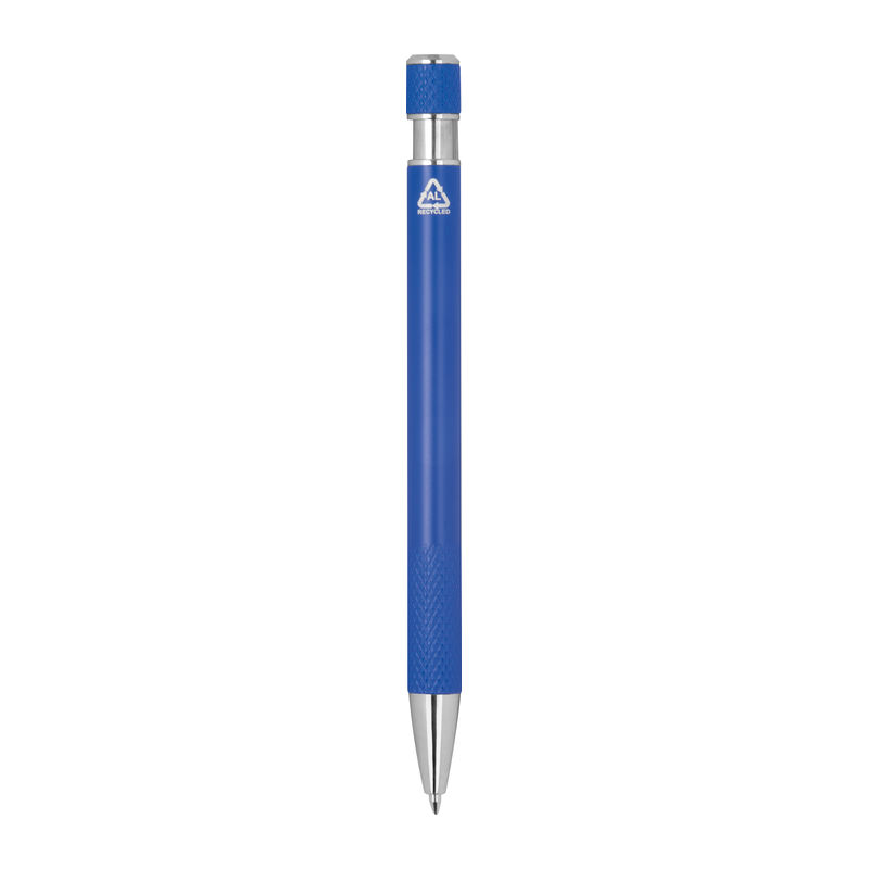 Pix din aluminiu reciclat, cu grip modelat, mecanism cu buton și mină albastră.