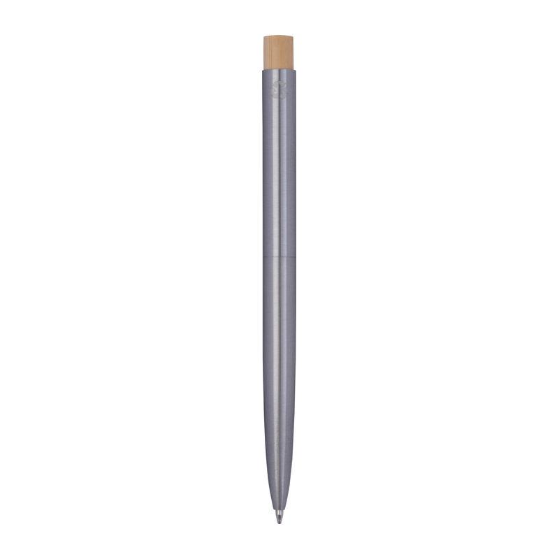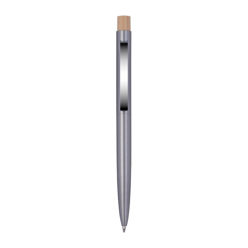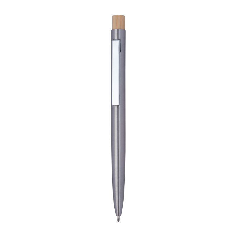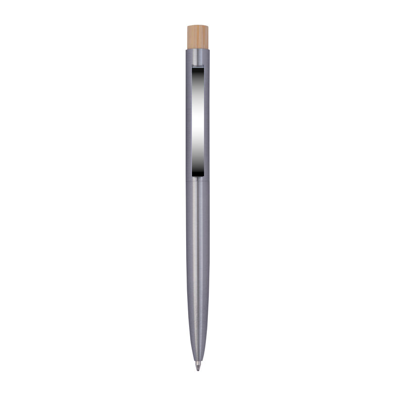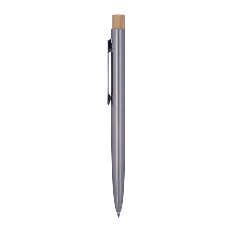 Ballpen din oțel inoxidabil reciclat, cu buton din bambus și rezervă de mare capacitate cu cerneală albastră.