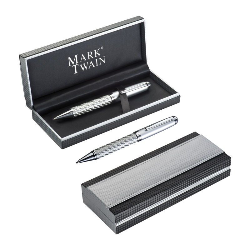 Pix Mark Twain "Columbia", care se deschide prin rotire, cu design carbon argintiu cu mină mare albastră şi un penar potrivit.