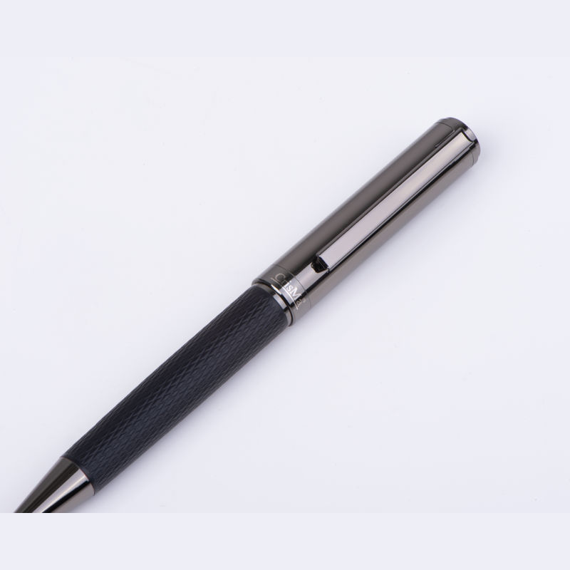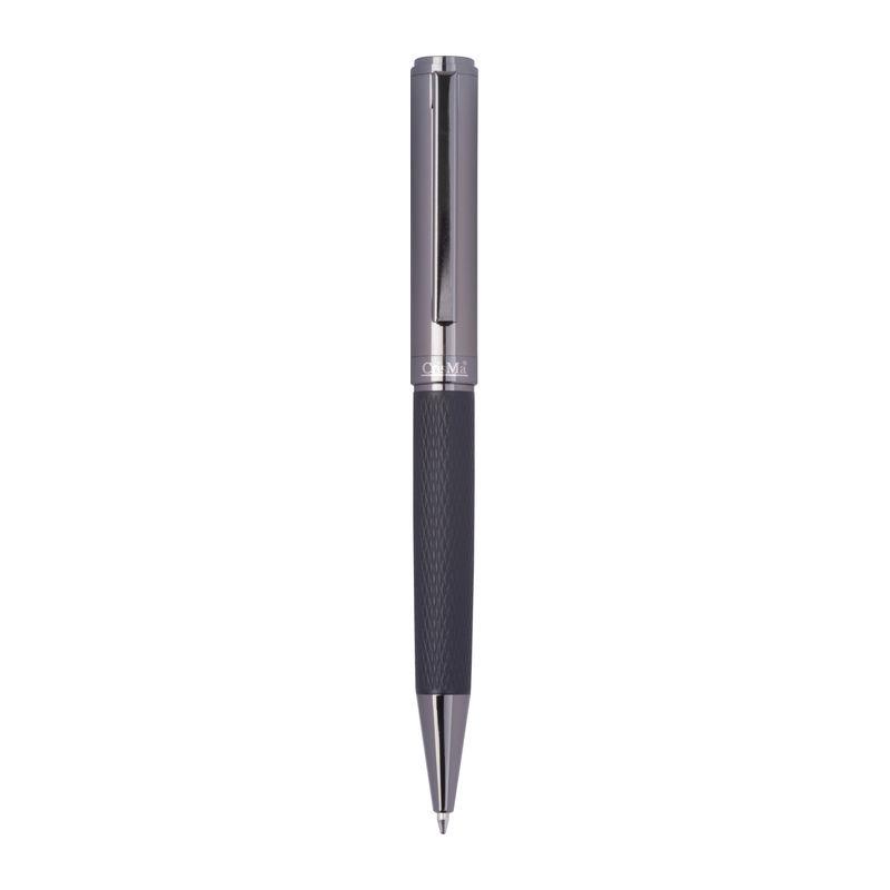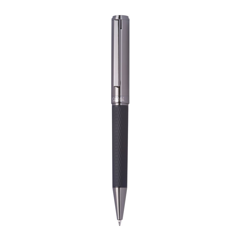 Pix metalic CrisMa cu grip modelat, cerneală albastră, lungime de scriere 1200 m, ambalat într-o cutie cu închidere magnetică. Logo mic CrisMa gravat sub clip.