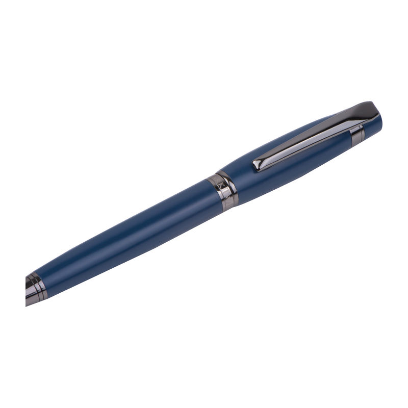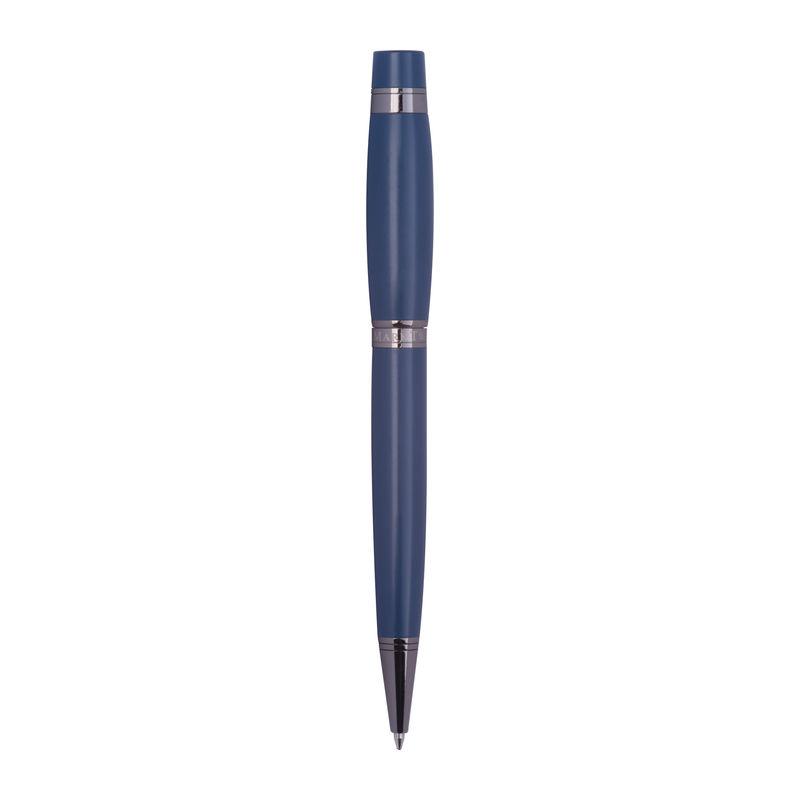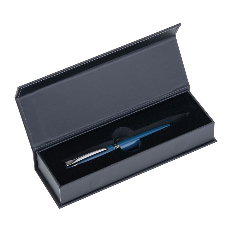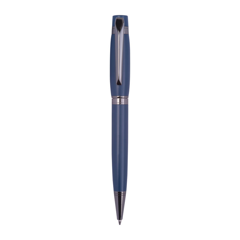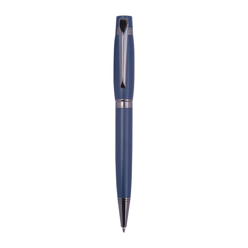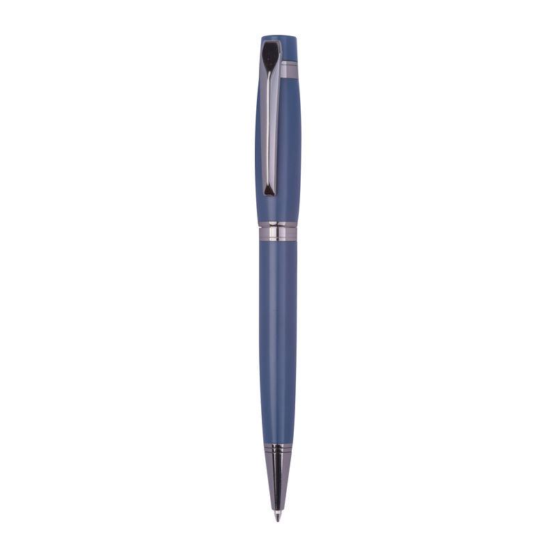 Stilou cu bilă Mark Twain din metal cu logo discret Mark Twain pe clip și lungime de scriere de 800 m, mină albastră. Ambalat într-o cutie pliabilă cu logo lucios Mark Twain.