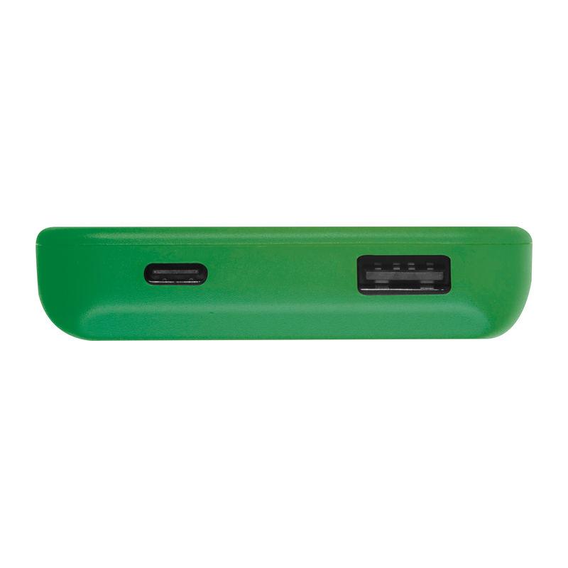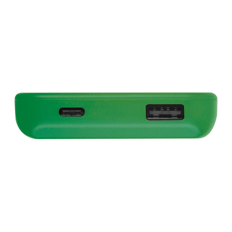 Powerbank (10.000 mAh) din plastic reciclat (RABS) cu două porturi: USB-C in/out 5V/2,1A și USB-A out 5V/2,1A. Include cablu de încărcare de 50 cm.