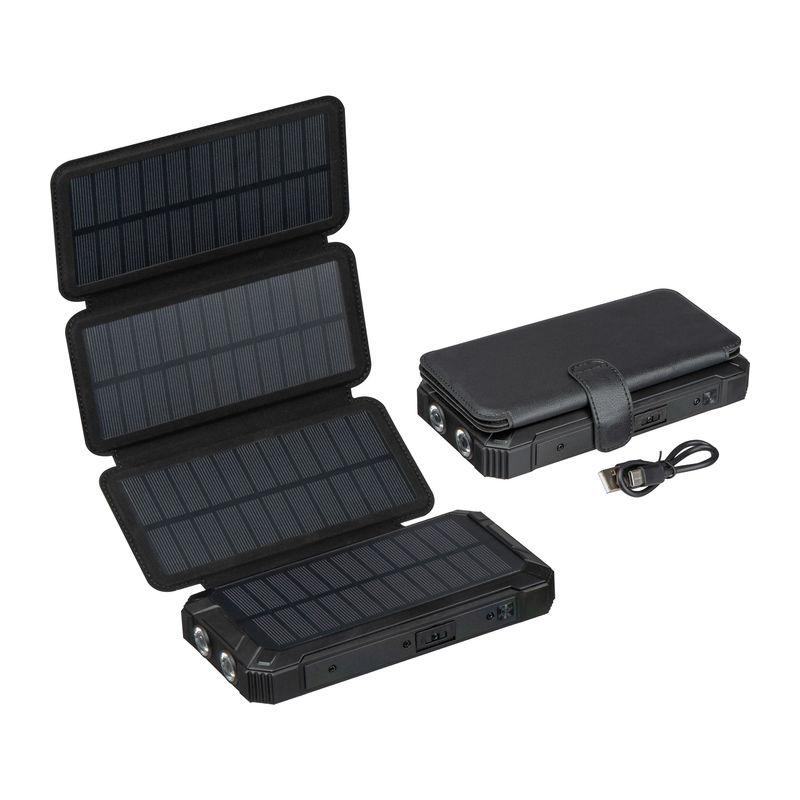 Power bank solar cu o capacitate de 20.000 mAh și patru panouri solare pliabile pentru o alimentare optimă cu energie.