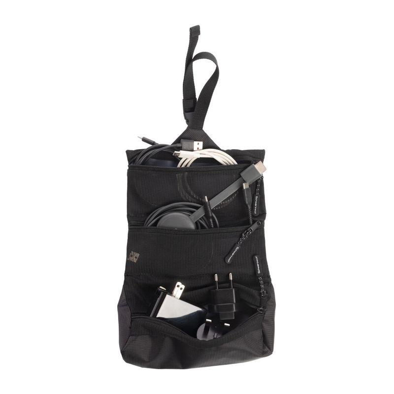 Practical multi-purpose Schwarzwolf bag for cosmetics and small items in black for comfortable travel. It can be used as an electronics organizer. The bag contains 3 mesh zippered pockets. It includes a buckle that can be used to close the rolled bag or to create a loop for hanging the bag.