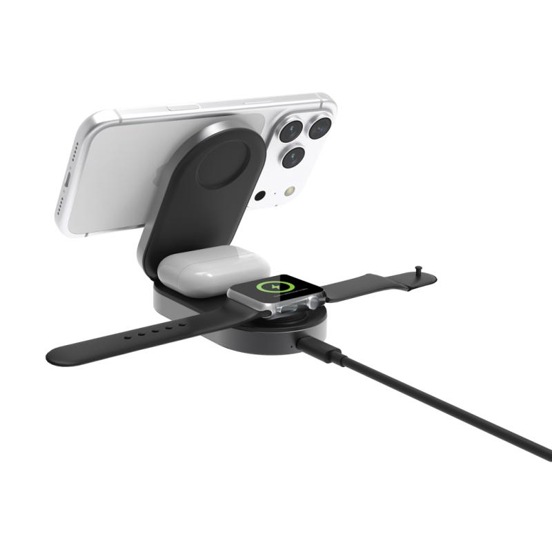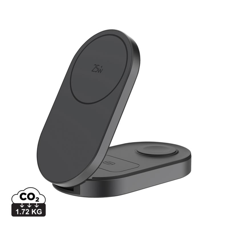 Experience ultra-fast 25W magnetic wireless charging with Quantum Ultra-Fast 3-in-1, the foldable charging solution designed to power your phone, Apple Watch, and earbuds simultaneously. Its high-performance system ensures stable and efficient charging across all three devices, while advanced safety and temperature protection provide secure, reliable use at all times. The foldable design makes it exceptionally compact and ideal for travel, offering powerful performance wherever you go. Made out of RCS certified recycled ABS plastic. RCS (Recycled Claim Standard) is a standard to verify the recycled content of a product throughout the whole supply chain. Total recycled content: 51% based on total item weight. The USB-C input ensures consistent energy delivery for optimal 25W output, and the item and accessories are PVC-free and packed in FSC® mix kraft packaging. Including a 120 cm USB-C to USB-C cable made from RCS-certified recycled TPE. Minimum input: 9V/3A for optimal use.