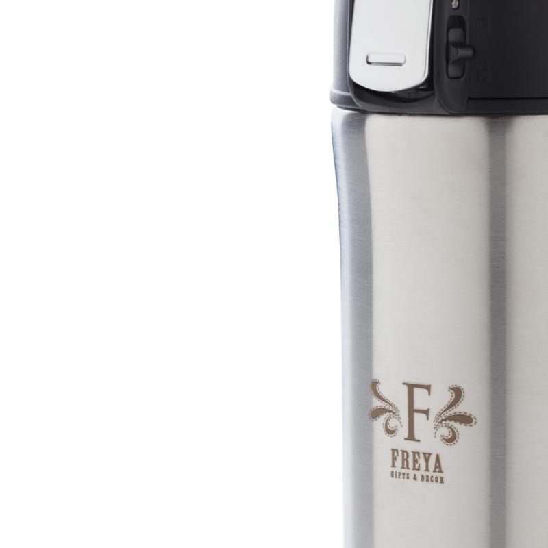 This great double wall stainless steel vacuum mug keeps your drink warm for up to 5 hours or cool for up to 15 hours. The lid is lockable and therefore avoids any risk of leaking or spilling. The lid is easy to keep clean for optimal hygiene and is dishwasher safe. The unique design of the mug allows you to drink conveniently and safely with one hand directly from the mug. The size of the mug is suitable to place in any car drink holder. Made with RCS (Recycled Claim Standard) certified recycled materials. RCS certification ensures a completely certified supply chain of the recycled materials. Total recycled content: 71% based on total item weight. BPA free. Capacity 300ml. Including FSC®-certified kraft packaging.
