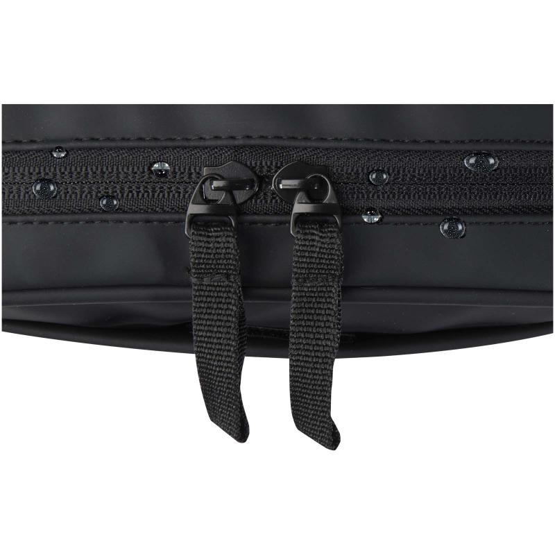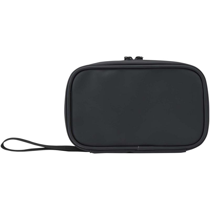 Made from GRS certified recycled PU leather with a matching RPET lining, this tech pouch is designed for travellers, remote workers, and tech enthusiasts. Compact and easy to carry in a backpack or cabin bag, it has a zipped main compartment with practical organisation features including an elastic pen loop, two mesh pockets for earbuds and small accessories, a reinforced divider, and multiple elastic loops to securely hold cables, USB drives, and chargers. The exterior includes a front pocket with hook-and-loop closure for quick access, along with a webbing handle for convenience. Finished with a water-resistant coating, it keeps your essentials protected wherever you go. Volume capacity: 1 litre.