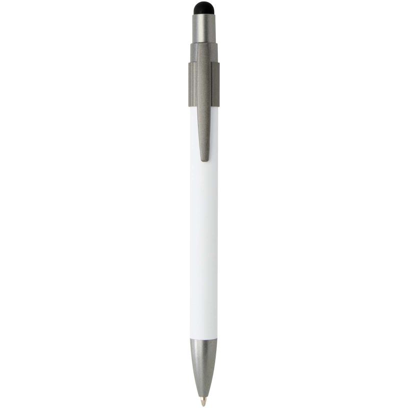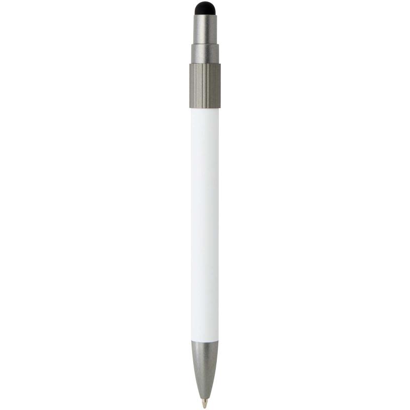 Ballpoint pen with stylus and fidget spinner, combining practicality with a playful design. The pen is made from RCS certified recycled aluminium and features a smooth push mechanism and a stylus tip for touchscreen use. A built-in fidget spinner on top adds a stress-relieving touch (just flick to activate). Pen ink colour: blue. Writing length: 1000 metres.