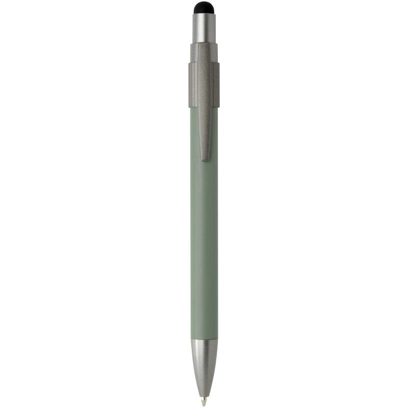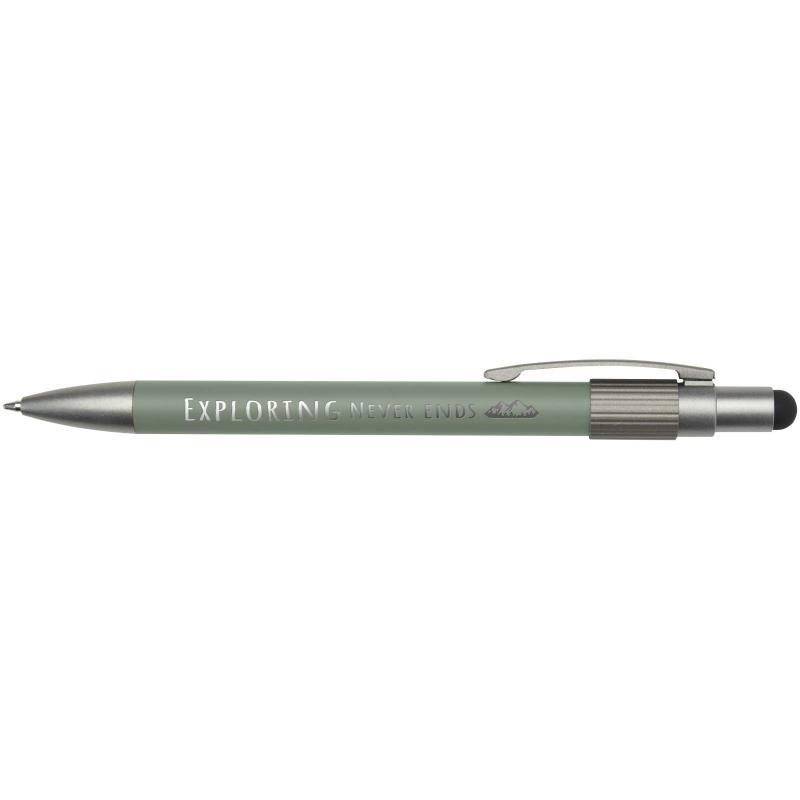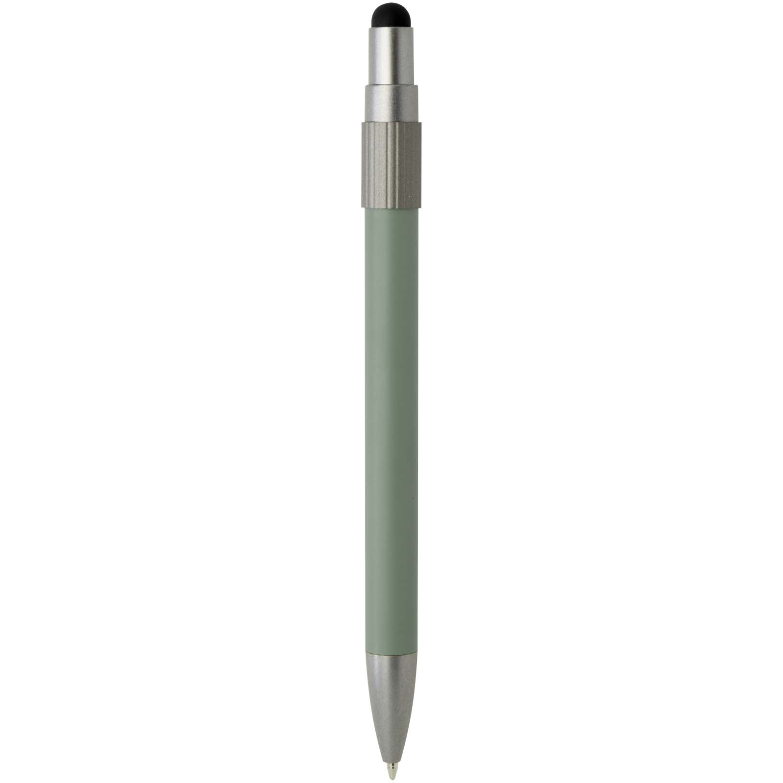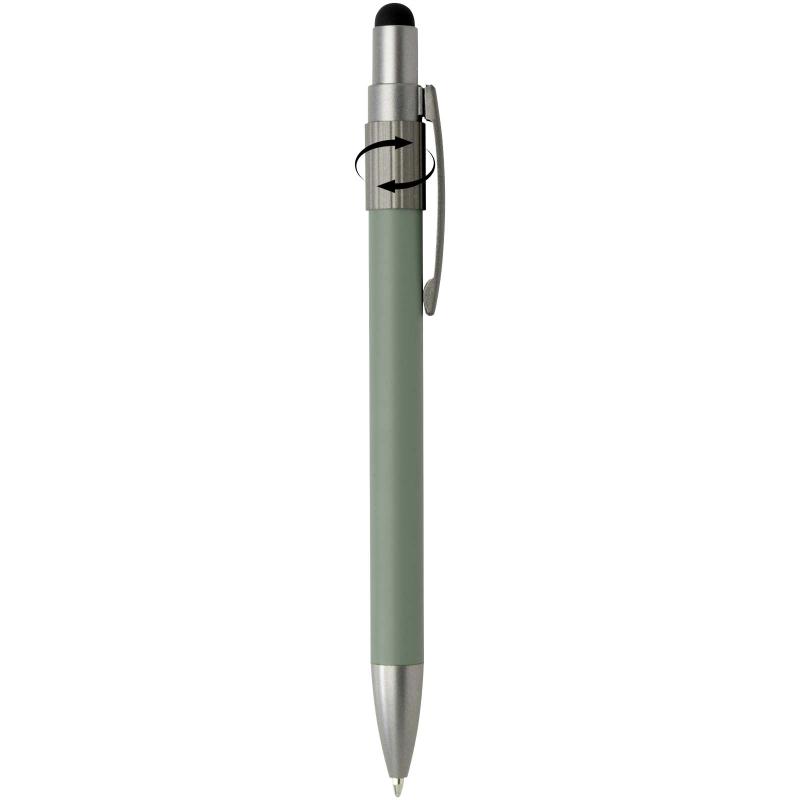 Ballpoint pen with stylus and fidget spinner, combining practicality with a playful design. The pen is made from RCS certified recycled aluminium and features a smooth push mechanism and a stylus tip for touchscreen use. A built-in fidget spinner on top adds a stress-relieving touch (just flick to activate). Pen ink colour: blue. Writing length: 1000 metres.
