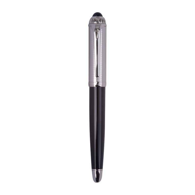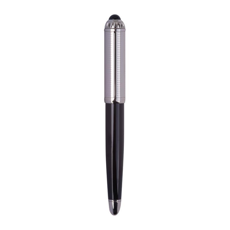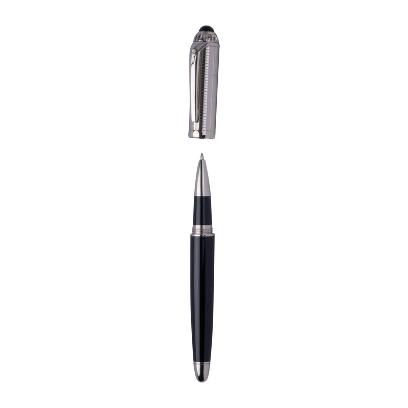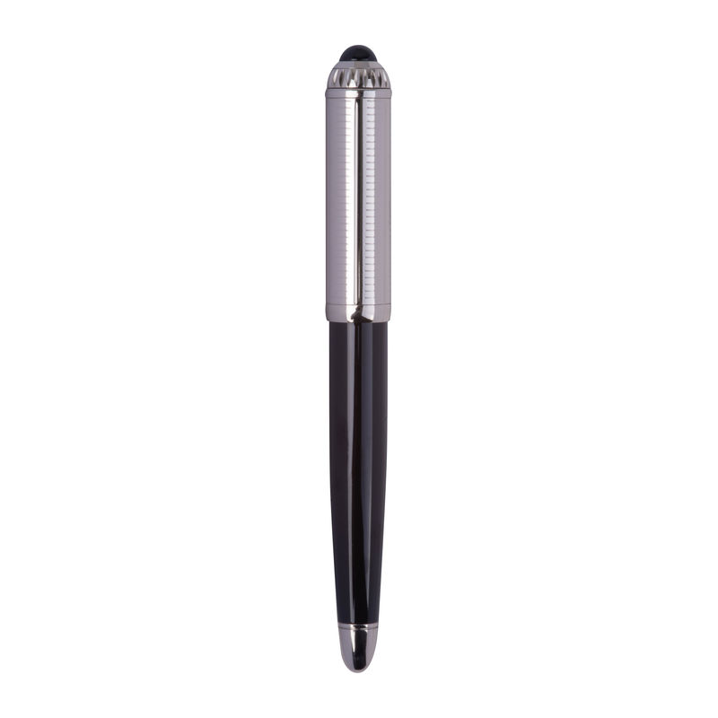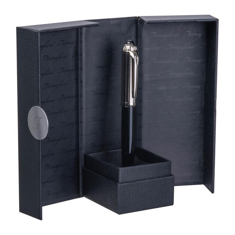 Rollerpen Ferraghini cu mină albastră, fabricat din oțel inoxidabil, cu litera „F” distinctivă pe clips, lungime de scriere 400 m. Ambalat în cutie de înaltă calitate, asortată cu stiloul.