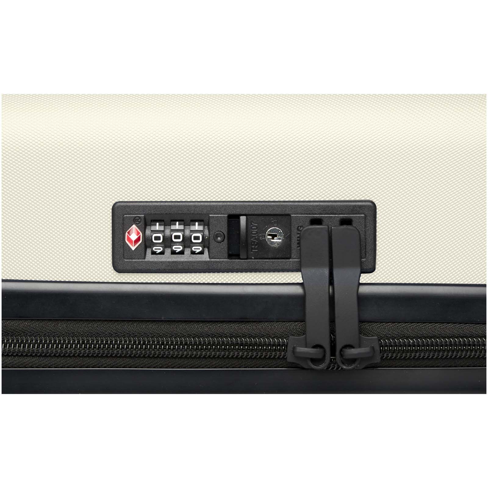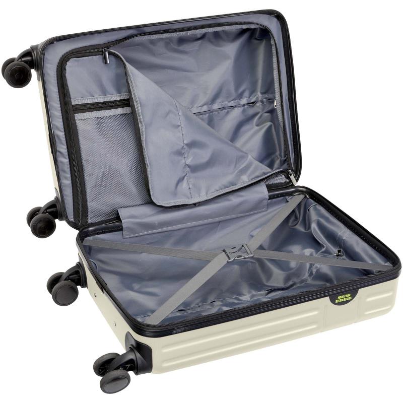 Constructed with impact-resistant recycled plastic and RPET lining, the 20” Rover cabin trolley stands for quality. It features a double-tube aluminium frame, 360 degree 4-wheel spinner, an integrated TSA combination lock, an easy grab handle for comfort, and interior divider organiser compartments. Can be brought as hand luggage on most mainstream airlines. This trolley is GRS certified, including the printing, making it a more responsible choice.