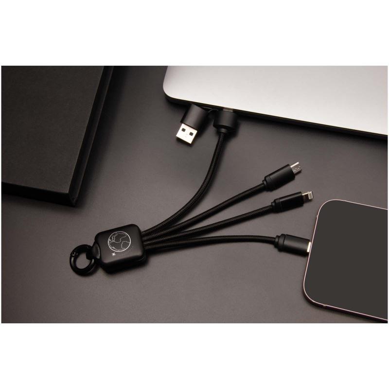 5-in-1 charging cable with 3 connectors (Type-C, Android, iPhone) and rPET cords (made from recycled plastic bottles). Thanks to its dual USB-A + USB-C input, the cable is 100% compatible with the latest computers on the market (USB-C). Metal-look finish on the end caps. The cable can charge up to 3 devices simultaneously. Delivered in a recyclable sleeve and a recycled paper card.
