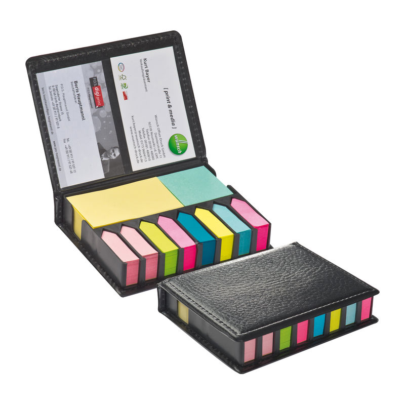 Setul de notiţe autoadezive conţine bloc notes galben şi albastru de 200 de file autoadezive şi 200 de benzi de marcat în 6 culori diferite. Partea interioară a copertei poate fi folosită şi ca port cărţi de vizită.