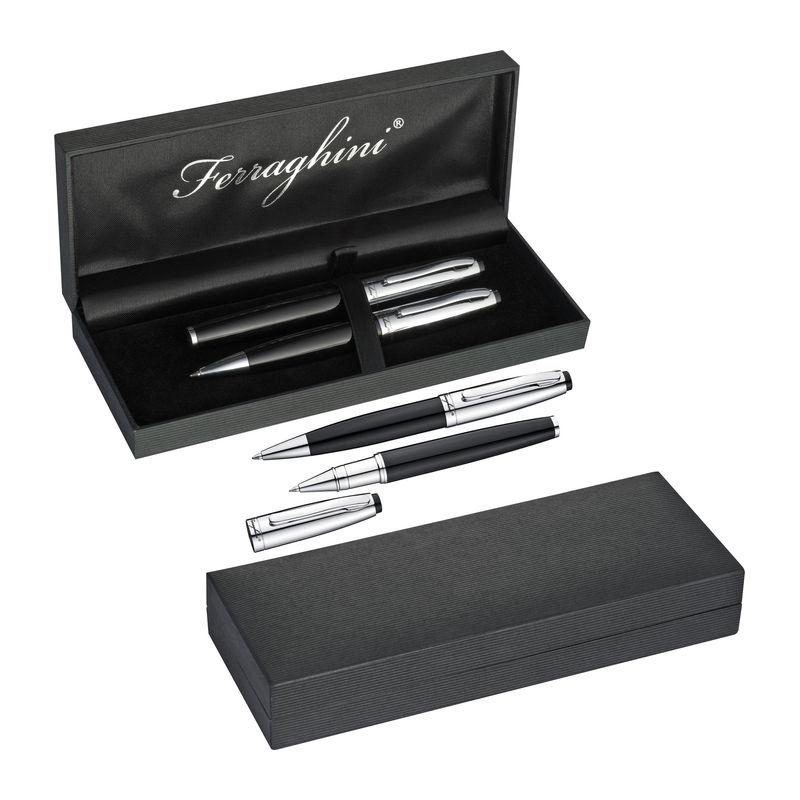 Set de scris Ferraghini clasic, care conţine un pix ce se deschide prin rotire şi un roller-pen (ambele cu mină albastră). Setul vine într-o cutie frumoasă neagră.