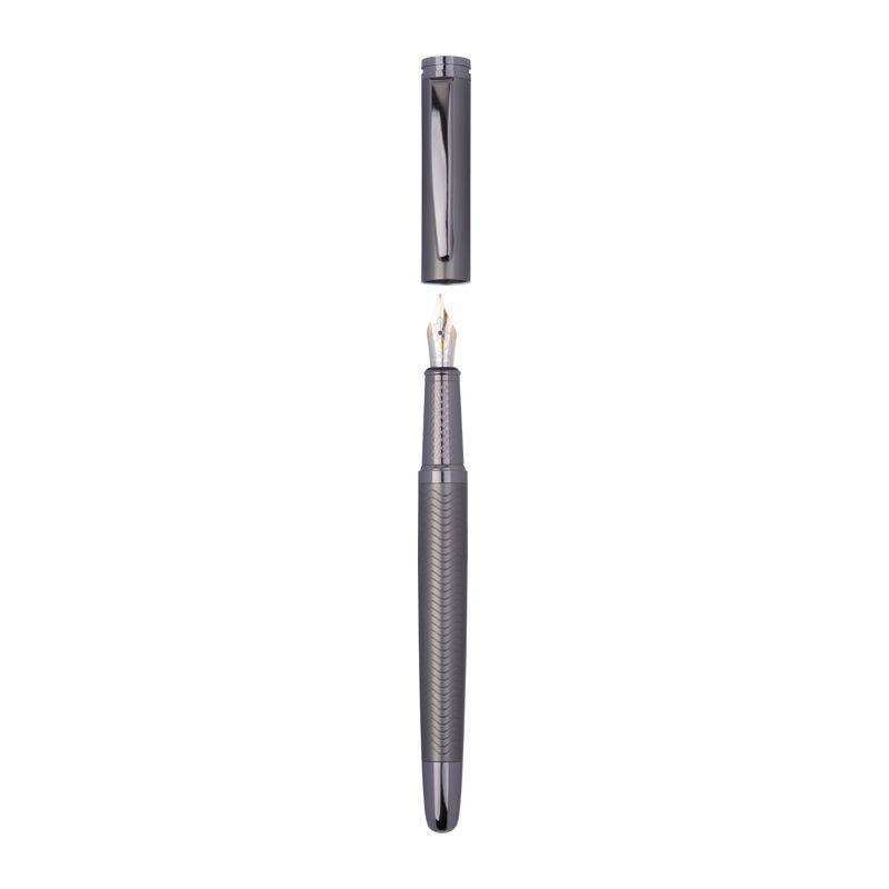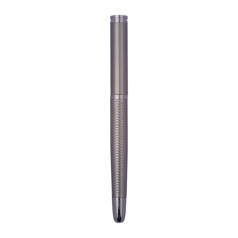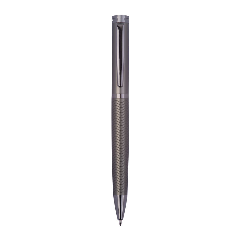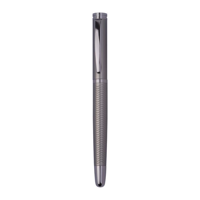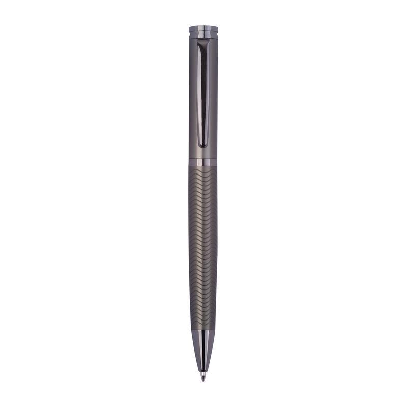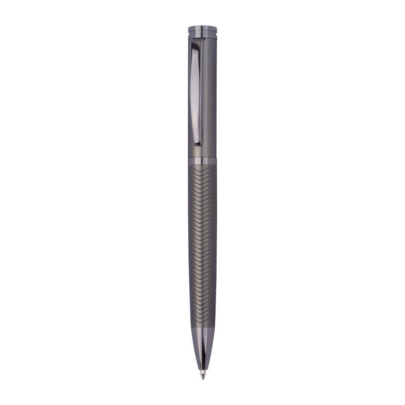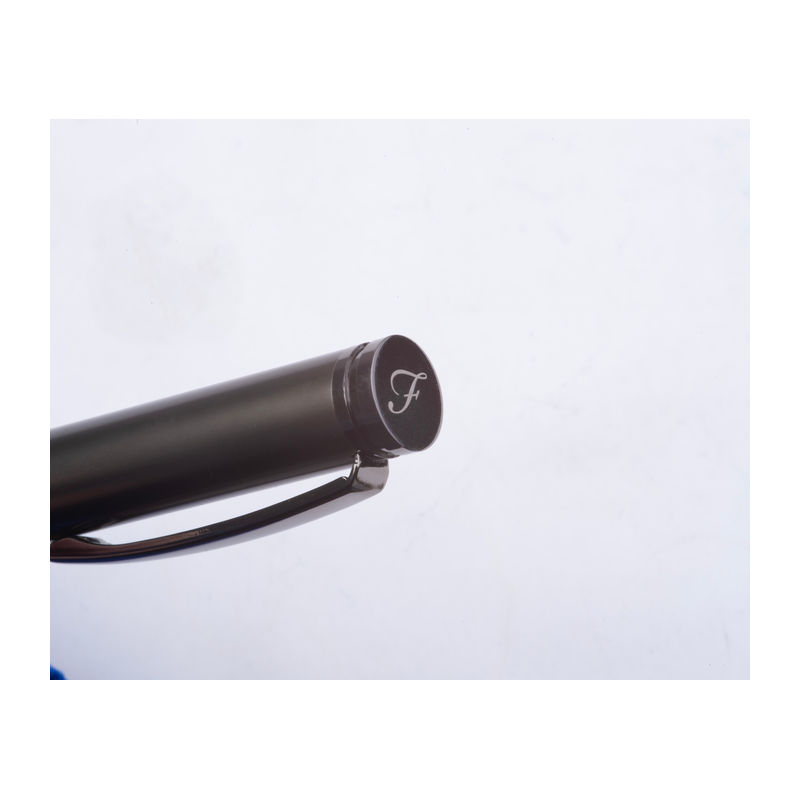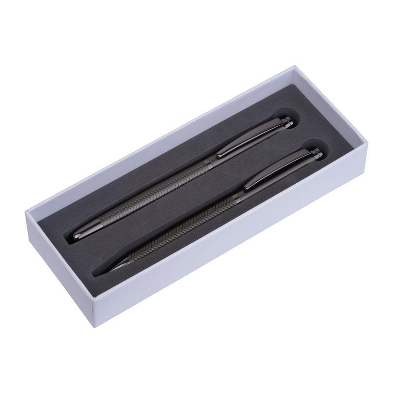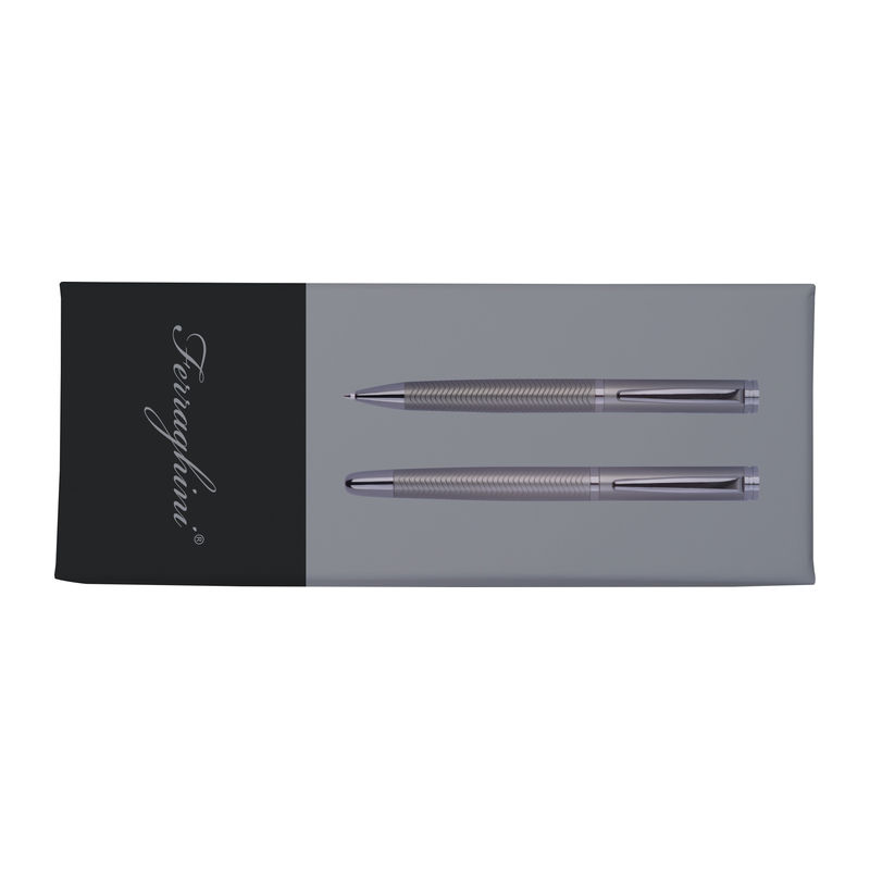 Set de scris Ferraghini compus dintr-un pix rotativ cu mină albastră (lungime de scriere 600 m) și un stilou (inclusiv cartuș albastru), din oțel inoxidabil.