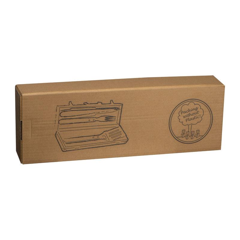 Set grill barbeque din 3 piese, împachetat în cutie metalică învelit cu bambus. Setul de grătar conţine furculiţă, spatulă și cleşte pentru grătar.