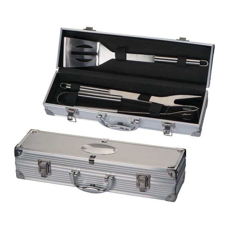 Valiză și set grill barbeque din metal, cu închizător şi mâner. Setul de grătar include o spatulă pentru carne, o furculiţă şi un cleşte pentru grătar.