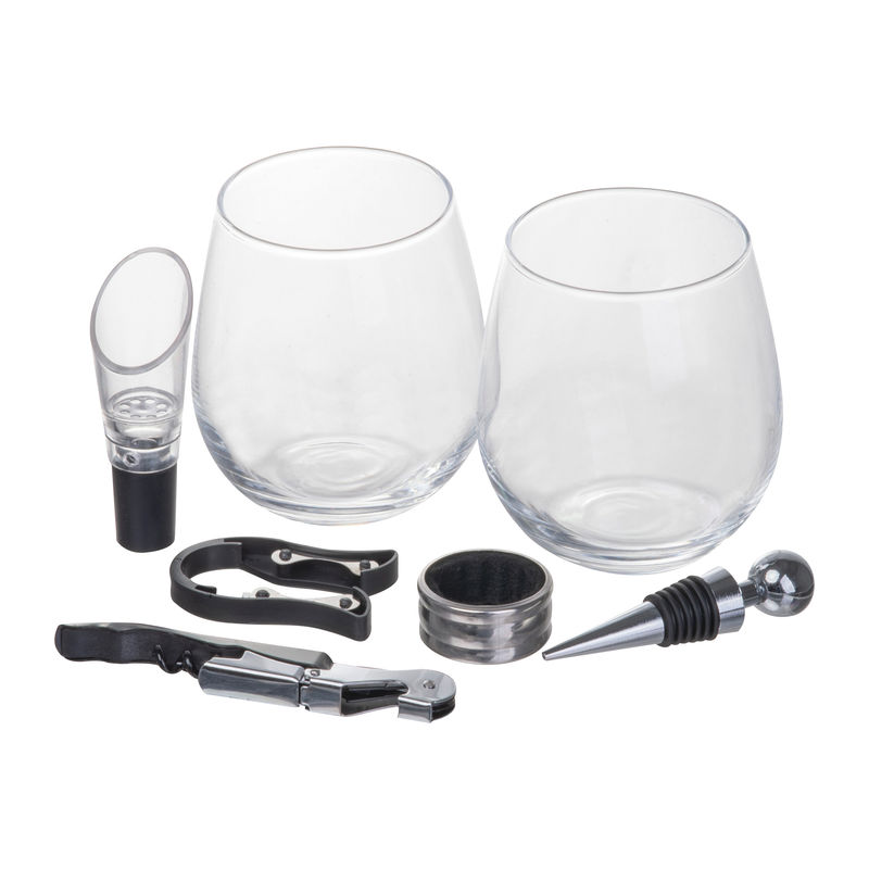 Set complet de vin cu două pahare (440ml fiecare), tirbușon, dop de vin, turnător, inel de vin și tăietor de folie.