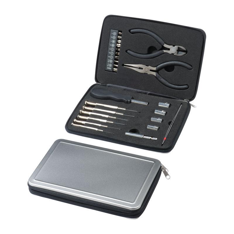 Set scule de 25 piese într-o cutie din aluminiu, cu fermoar, conţine 2 clești, biţi și șurubelniţe de diferite dimensiuni și o pereche de pensete ascuţite.