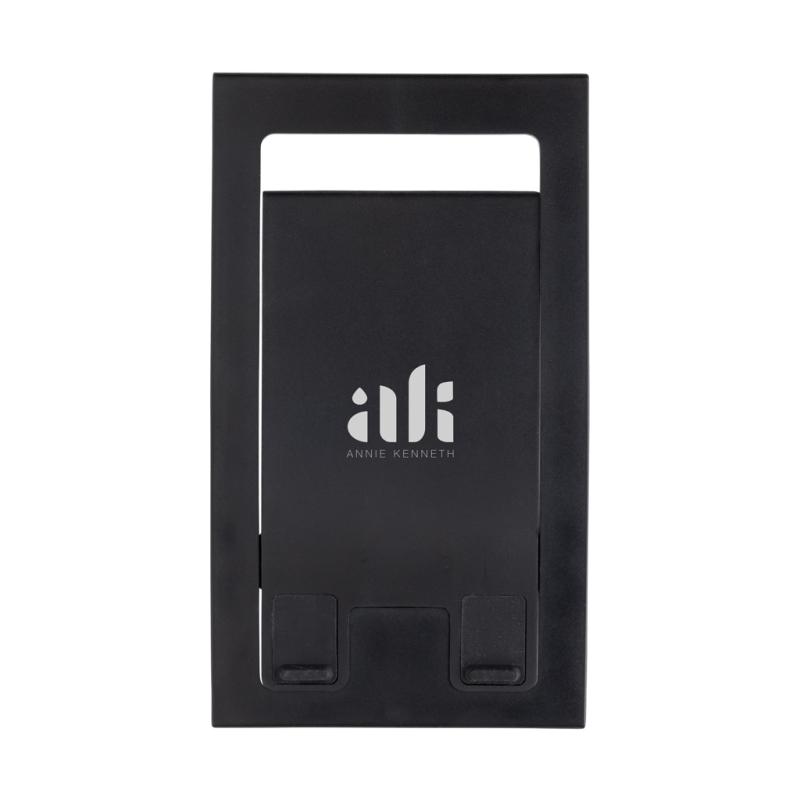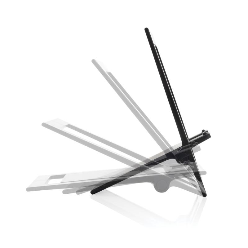 Flat and foldable phone stand made from RCS recycled ABS. The stand comes flat and folded and can be unfolded into a phone stand that can carry all size phones. The stand is strong enough to adjust the viewing angle. With silicon cushioning to keep your phone in optimal condition. Total recycled content: 85% based on total item weight. RCS certification ensures a completely certified supply chain of the recycled materials. Packed in FSC® packaging. PVC Free.