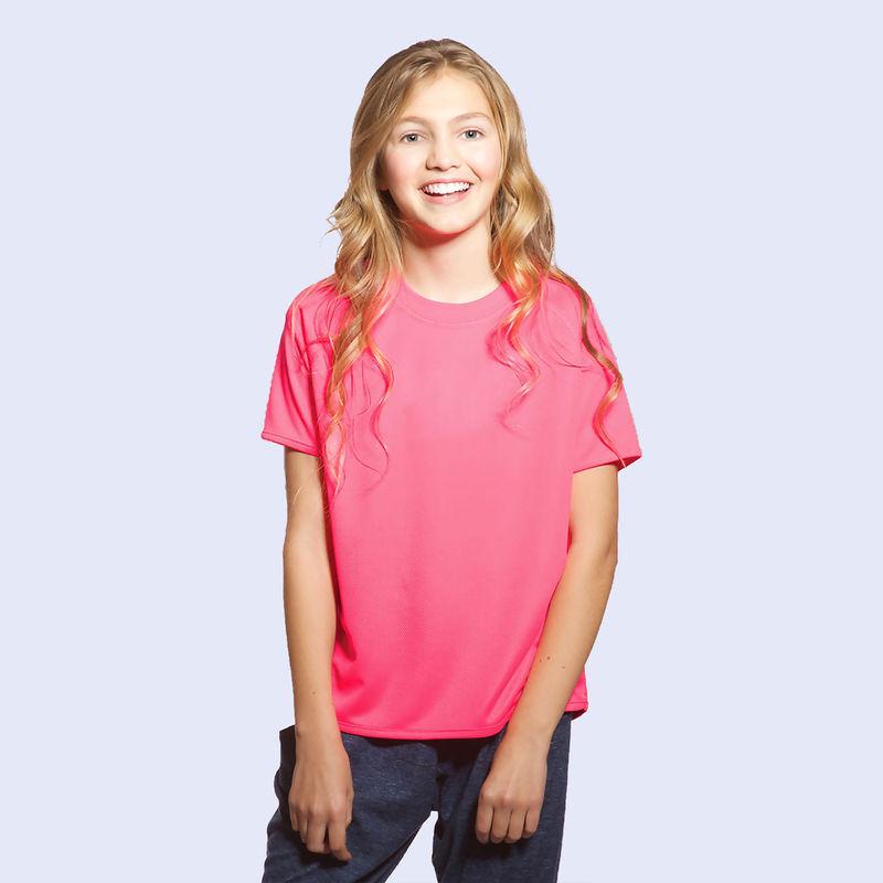 140 g/m² 100% Textured polyester kids sport t-shirt. Ultra tech moisture wicking action. Taped back neck, short sleeves, contoured drop back hem.