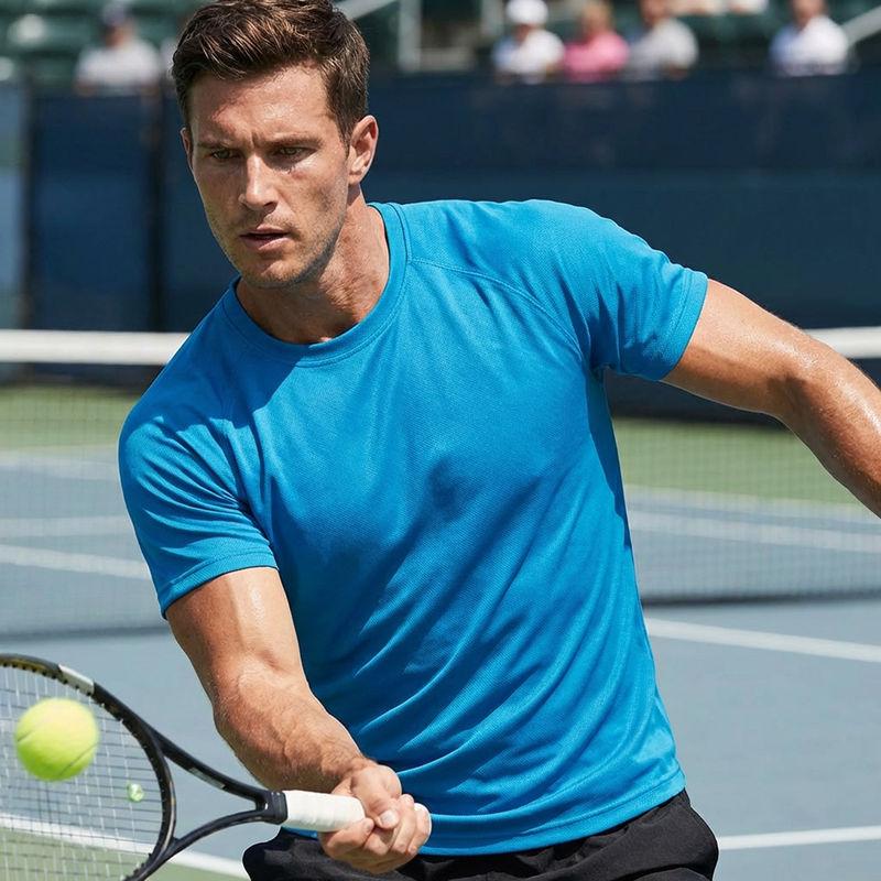 140 g/m² 100% textured polyester men's sport t-shirt. Crew neck comfort finish. Short raglan sleeves, anti chafe flat locked seams. Ultra tech moisture wicking action, contoured, drop back hem.