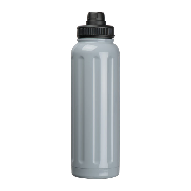 Sticlă metalică mare de băut, cu o capacitate de 1200 ml și cu izolare cu vacuum. Prevăzută cu dop cu filet și un dispozitiv suplimentar de închidere rapidă, precum și cu un şnur.