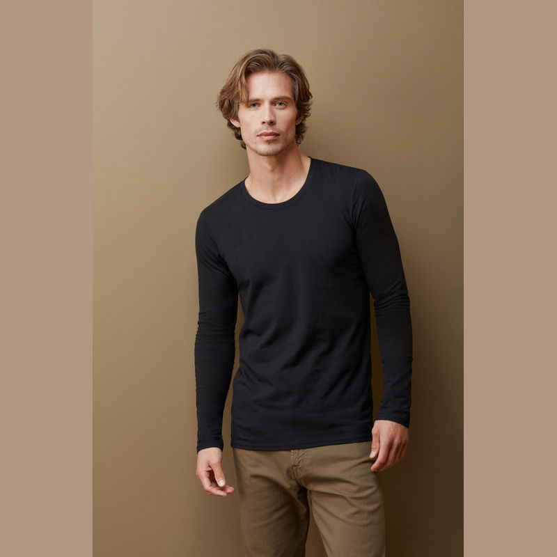 Fitted long sleeve T-shirt for men, made of a soft and sleek cotton-elastane-blend with contrast neck tape.