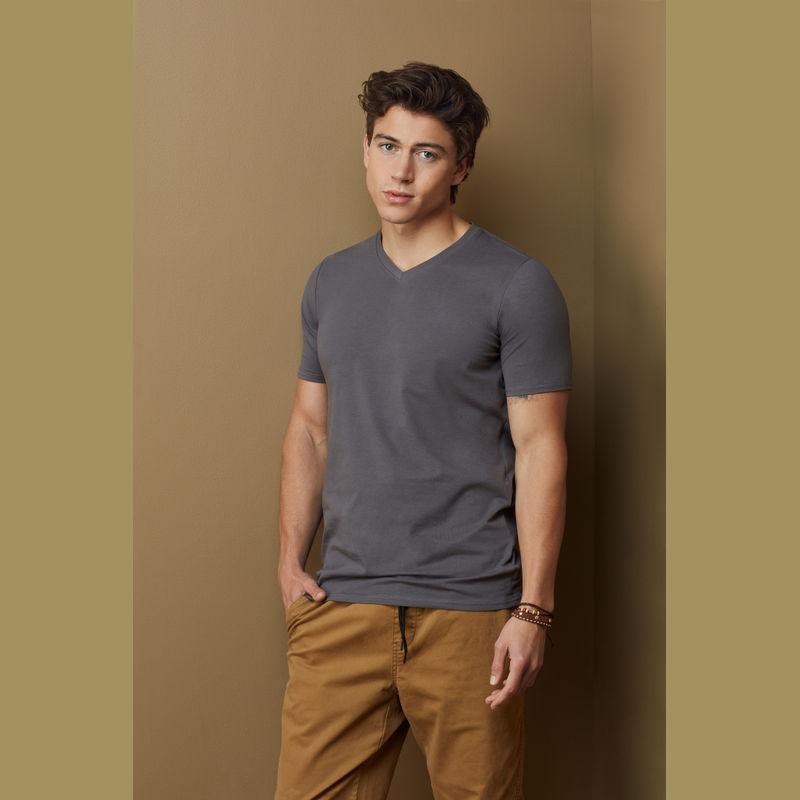 Fitted V-neck T-shirt for men, made of a soft and sleek cotton-elastane-blend with contrast neck tape.