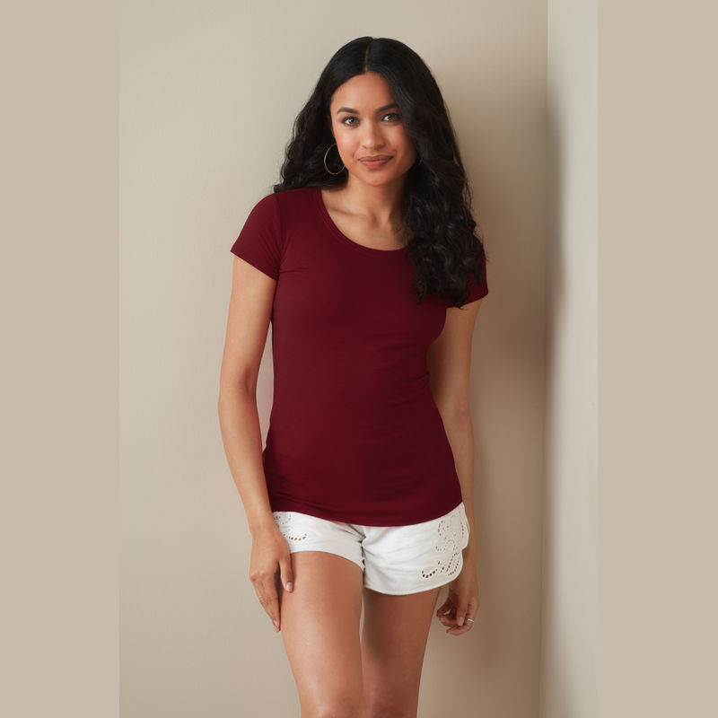 Fitted T-shirt for women, with fashionable length made of a soft and sleek cotton-elastane-blend with contrast neck tape.
