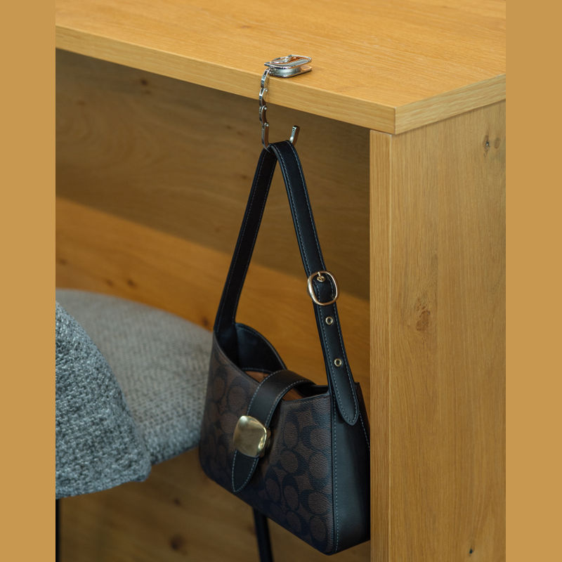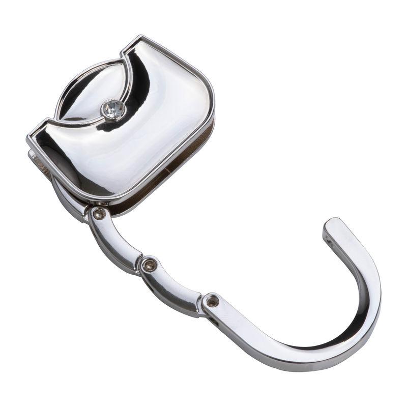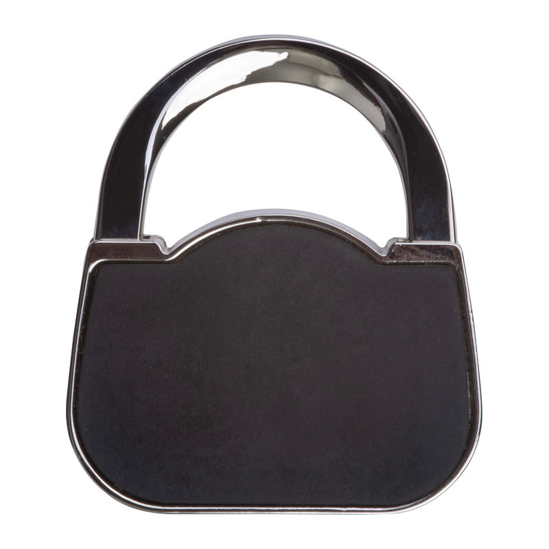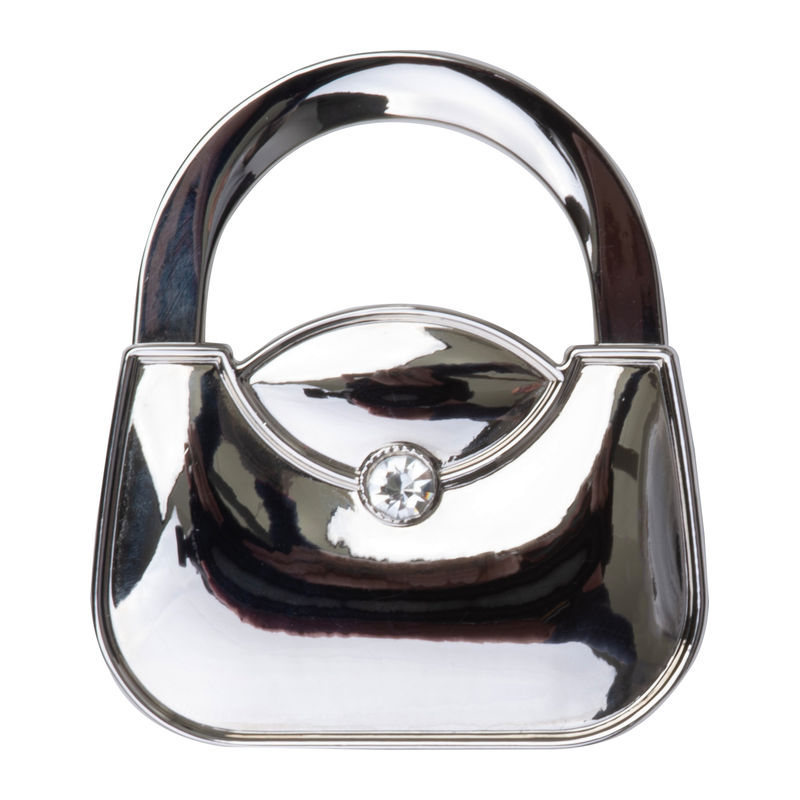 Suport metalic pentru geantă în formă de poșetă. Pur și simplu deschideţi cârligul, așezaţi suportul pe marginea mesei și agăţai geanta de cârlig.