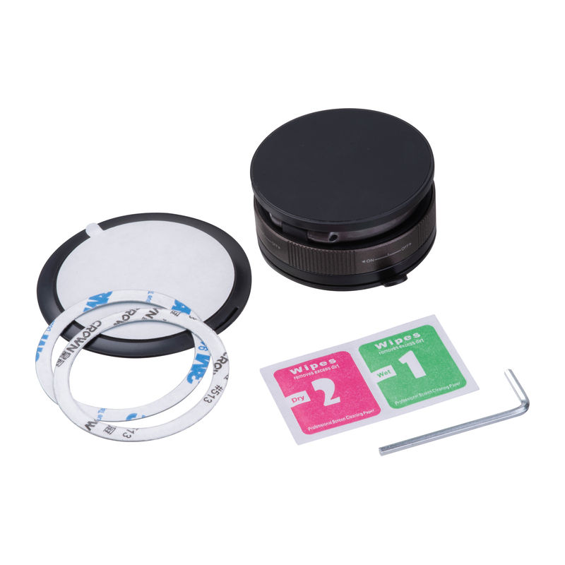 Suport magnetic robust din PE pentru telefon. Conținutul pachetului: 2 inele magnetice, 1 bază autoadezivă, 1 cheie imbus, o lavetă uscată și una umedă.