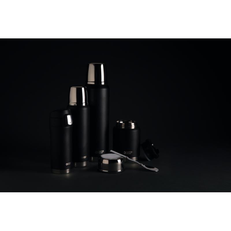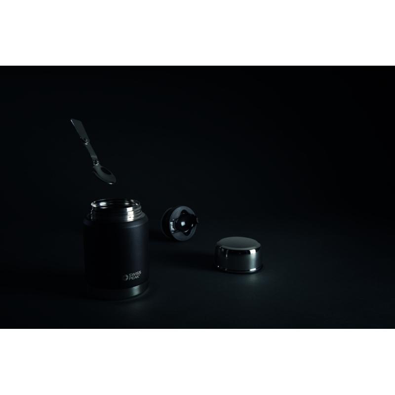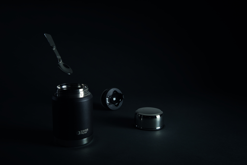 The Swiss Peak Elite series are with vacuum insulation and double wall 18/8 grade stainless steel. The powder coated black colour is built to last! No fading or cracking here! The inner wall is plated with copper for ultimate conductivity to keep drinks hot for 8 hours and cold for 24 hours. This food container keeps your food hot or cold all day long! A 18/8 SS spoon is included. Hand wash only. Leakproof. Content 500 ml.