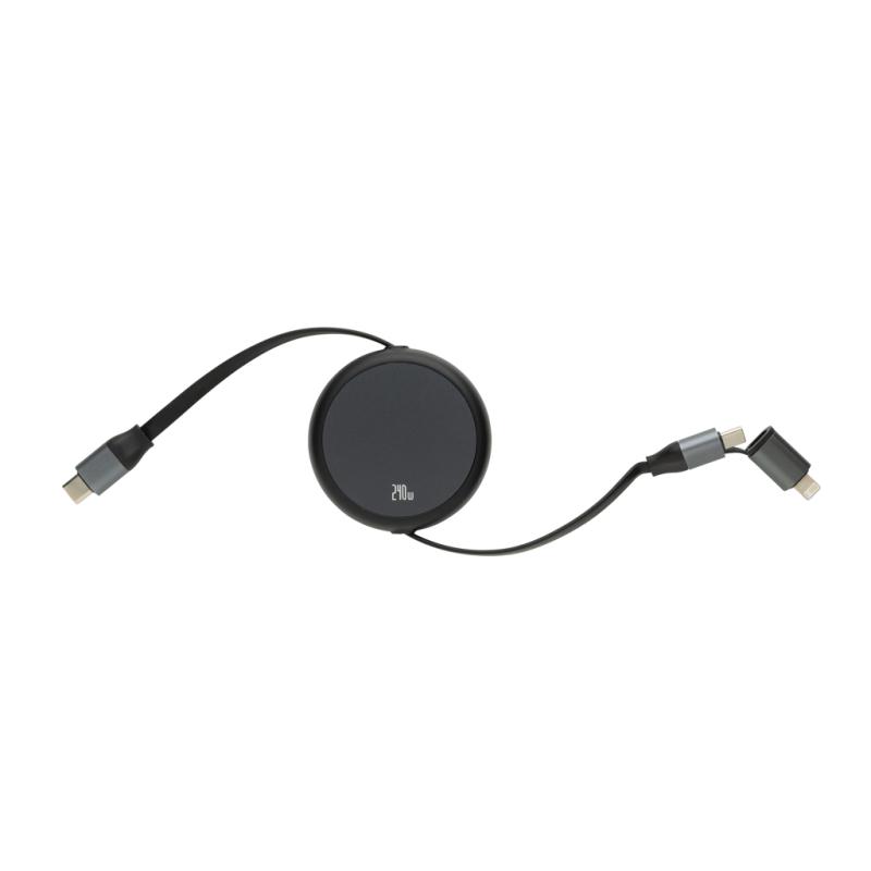 Terra RCS Recycled Aluminium Retractable 240W 2-in-1 Cable. Terra is a high-performance retractable charging cable designed for ultra-fast charging and maximum convenience. With a USB-C input and dual output connectors (USB-C and iOS), it powers everything from phones to laptops at lightning speed—up to 240W.The smart retractable mechanism extends from just one side, smoothly adjusting to four preset lengths for effortless use in any setting. Terra also supports data sync at 480 Mbps and is compatible with CarPlay and Android Auto, offering full functionality in one compact cable. Made out of RCS certified recycled materials, including recycled aluminium, ABS, TPE, and tin. RCS (Recycled Claim Standard) is a standard to verify the recycled content of a product throughout the whole supply chain. Total recycled content: 69% based on total item weight. PVC-free and packed in FSC® packaging.
