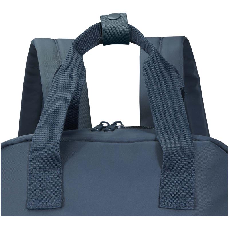 The Trip Aware™ recycled travel laptop backpack is a compact, lightweight backpack designed for streamlined travel and everyday use. Made from durable 290D twill polyester with a soft knitted backing and lined with RPET 210D/PU, it combines functionality with a clean, practical design. It features two side pockets for water bottles, dual carry handles, and comfortable shoulder straps. The front zip pocket includes organised storage for a passport, pens, and a ribbon for keys, while the main compartment fits a notebook or tablet. A separate 14” laptop compartment and a trolley sleeve on the back make it especially suitable for travel. Each bag also comes with an Aware™ tracer. This innovative feature allows users to trace the origins and journey of their item through a QR code, enhancing transparency in the supply chain and fostering a stronger connection between the product and its production process. Volume capacity: 9 litres.