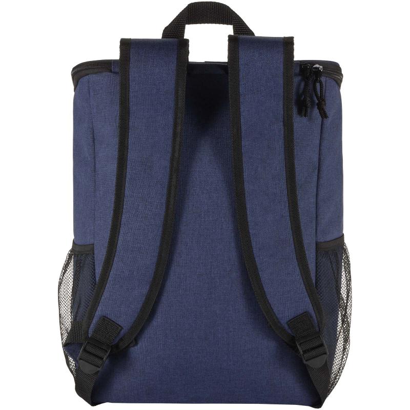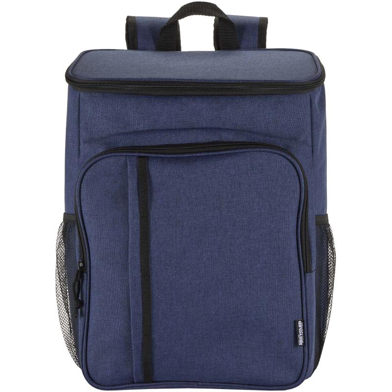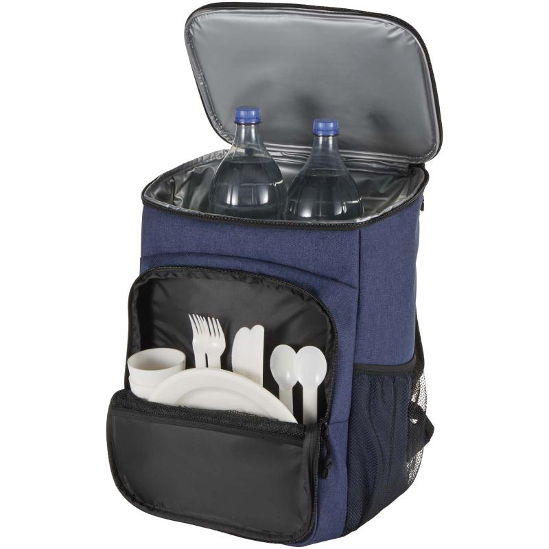 The Tundra picnic cooler backpack is made from GRS certified recycled materials and comes with a reusable two-person cutlery set made from food-grade plastic. Its leak-proof main compartment, insulated with high-density foam and a heat-sealed PEVA lining, keeps food and drinks chilled for hours. For added convenience, it includes two side mesh pockets, a zipped front pocket with tableware (two knives, two forks, two cups, and two plates), and an extra zipped pocket on top. Padded adjustable shoulder straps and a sturdy webbing handle make it comfortable to carry, making this backpack an ideal companion for picnics, outdoor dining, camping, or beach trips. Volume capacity: 20 litres.