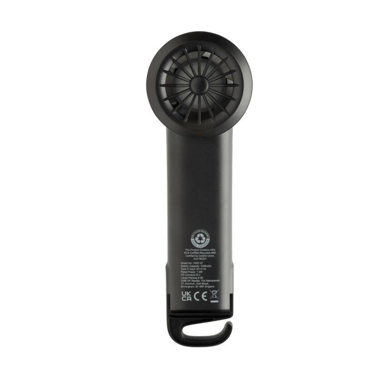 The Twist portable fan, made from RCS certified recycled plastic, is a compact and versatile solution to stay cool anywhere. Its sleek black body, made from 35% RCS recycled ABS, houses a rechargeable 1200 mAh Li-ion battery, providing up to 6 hours of working time with just 3 hours of charging via the included 30 cm black TPE USB-A to USB-C cable. With three adjustable speed levels and an extendable hook that doubles as a stand, the Twist fan is perfect for use at a desk, bedside, or while travelling.The case is made from RCS certified recycled ABS plastic. RCS (Recycled Claim Standard) is a standard to verify the recycled content of a product throughout the whole supply chain. Total recycled content: 35 % based on total item weight. This fan is PVC-free and packaged in an FSC® certified kraft box. Max. power: 2W | Input current: 5V / 1A