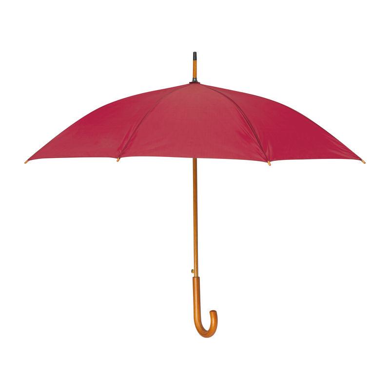 Umbrelă automată cu tijă şi mâner curbat din lemn.