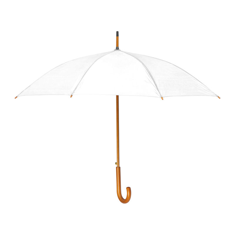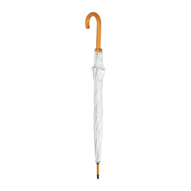 Umbrelă automată cu tijă şi mâner curbat din lemn.
