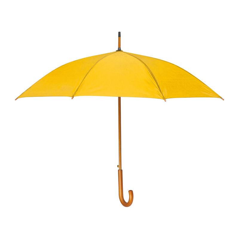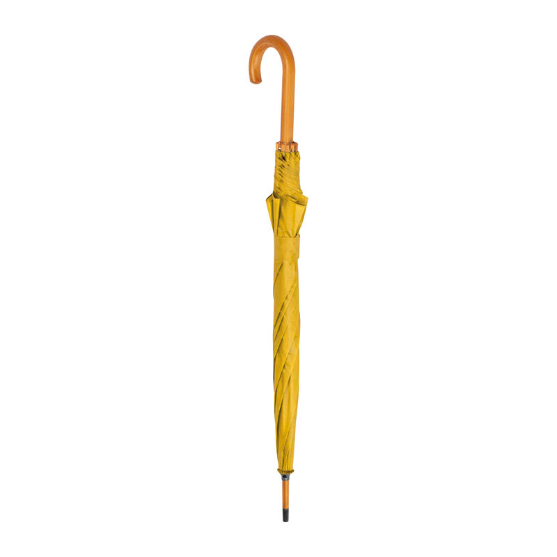 Umbrelă automată cu tijă şi mâner curbat din lemn.